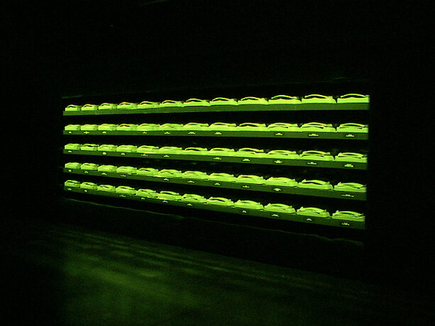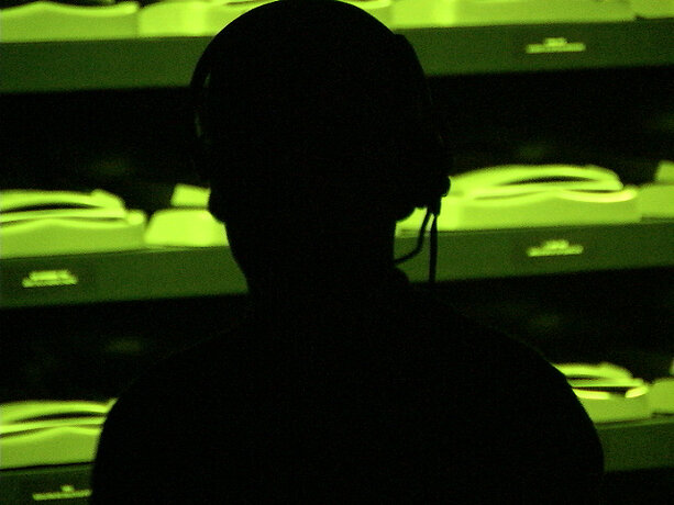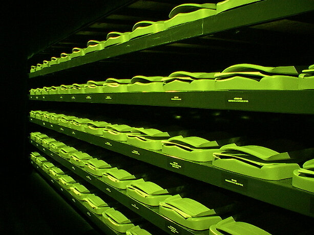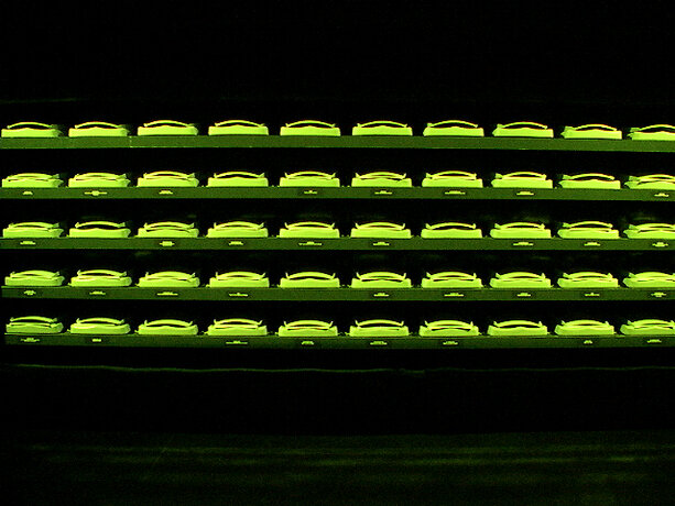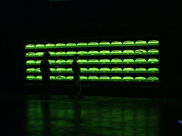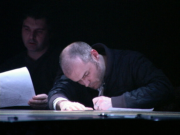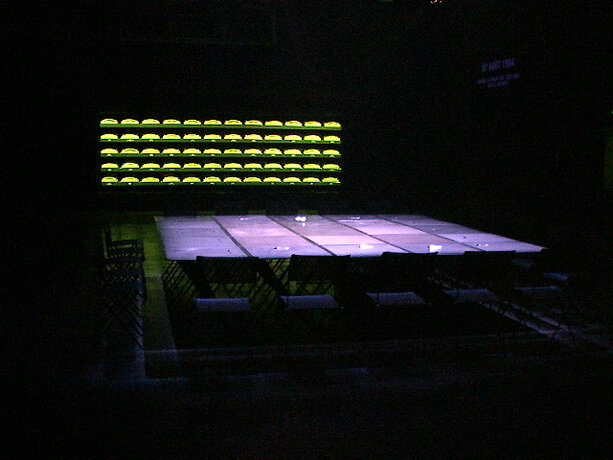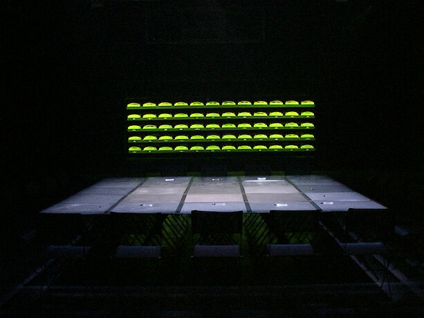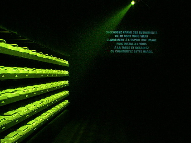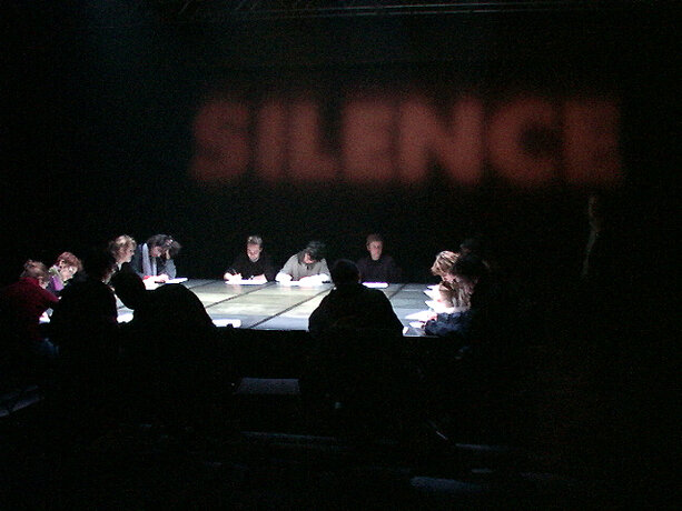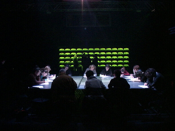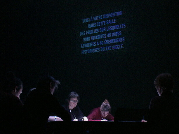 Ici, le processus se déroule dans l’espace de la fiction, qu’est la boîte noire du théâtre, et élabore la participation de chacun sur des éléments autoritaires. Le protocole est énoncé sous forme de loi, répétée verbalement et visuellement. Le mot “silence” est projeté en rouge sur le mur. Les voix amplifiées des acteurs lisent en permanence, comme pour un lavage de cerveau. Les participants installés autour de la table quadrillée n’ont pas droit à l’échange, ne sont pas dans un “être ensemble” mais chacun dans sa solitude devant son choix et sa page blanche. On est dans un espace totalitaire. La position modeste de l’artiste, en retrait dans le noir, “commis aux écritures” veillant à la fluidité du fonctionnement de l’installation, devient une surenchère d’autorité. Il est présent mais invisible des participants, qui, aveuglés par la lumière de la table et cernés par l’obscurité, regagnent la sortie à tâtons, une fois leur travail accompli. Le protocole est une machine, absorbant des visiteurs selon un compte annoncé à l’extérieur ; l’artiste joue un rôle de contremaître, un rouage de l’organisation. La violence du dispositif fait échapper à l’angélisme de l’art réparateur social, comme à la mondanité. Chacun est confronté à sa solitude, face à la question posée.