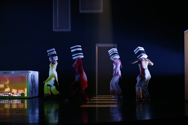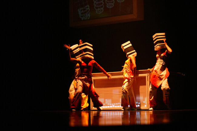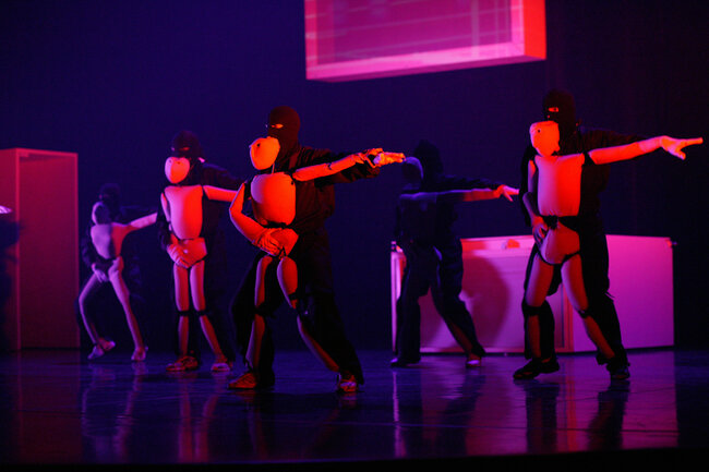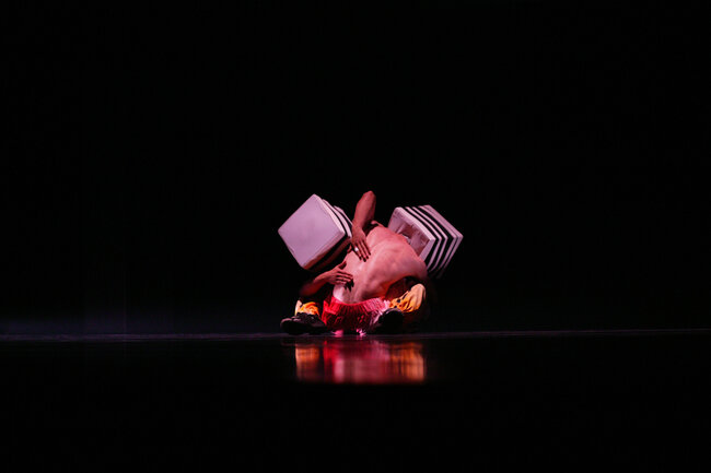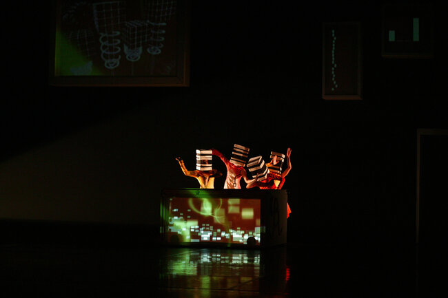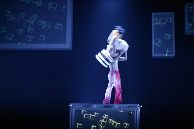 Ces corps en construction laissent apparaître une identité masculine et une identité féminine. « Il » et « elle » se cherchent, se confrontent, se rencontrent dans des jeux de séduction. Les danseurs s’amusent et ironisent sur la rencontre du couple homme-femme. On se prend par la main, on s’embrasse, par le biais de marionnettes qui ajoutent à la scénographie, des effets visuels inédits et plein d’humour. La danse s’écrit et se construit à travers la transformation des corps, quels que soit leur identité.