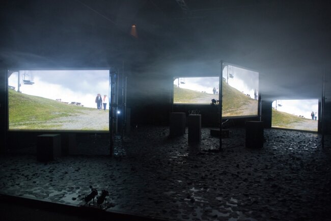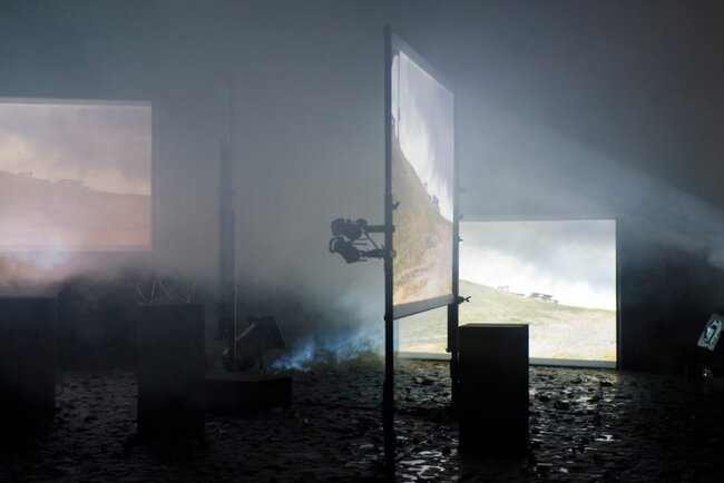 Un homme au milieu de quatre images projetées.