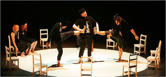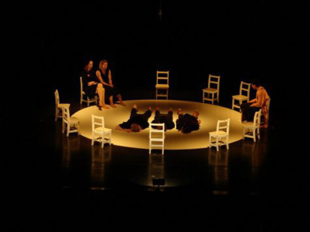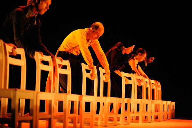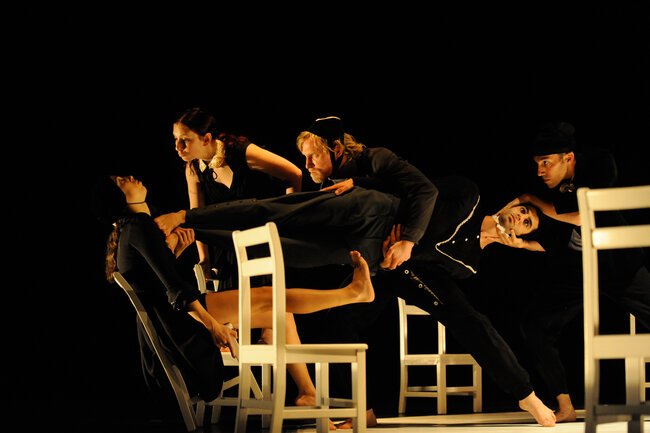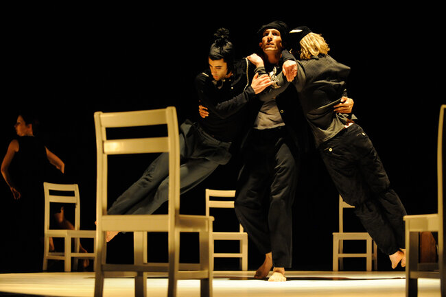 The first of Pilobolus’s collaborating partners projects, Rushes (2007) is the result of Inbal Pinto and Avshalom Pollak’s collaboration with Pilobolus Artistic Director Robby Barnett and the company. In an isolated community of broken dreams, Jacques Tati meets Gogol in a breakthrough for Pilobolus’s constantly morphing aesthetic.