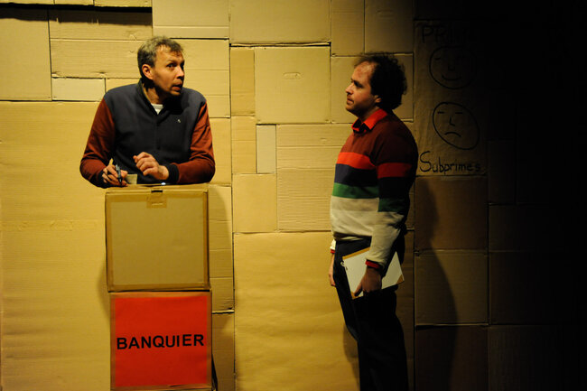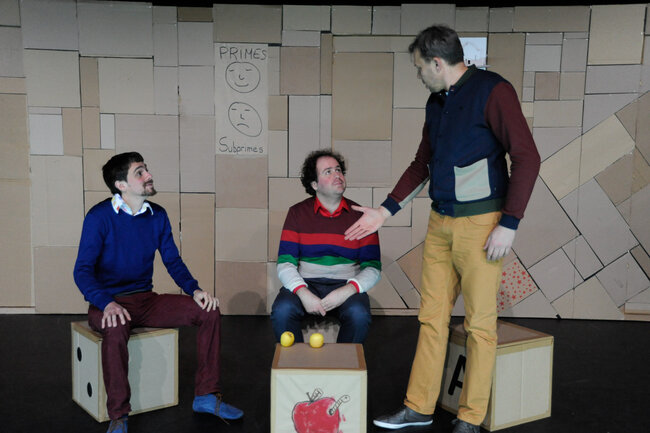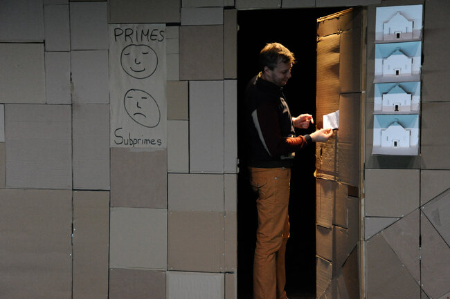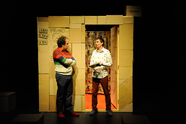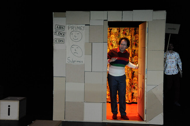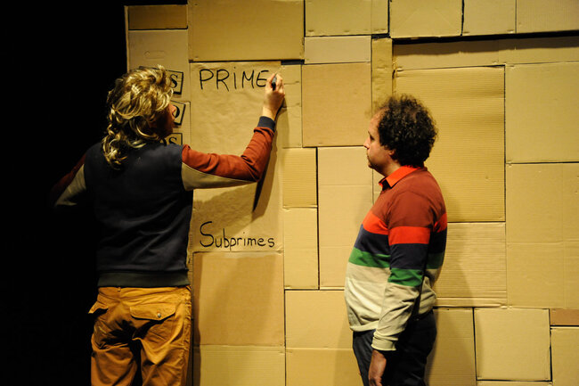 Alors, devant le public, avec le public, ils vont rejouer toute cette histoire et incarner tour à tour des banquiers, des citoyens, des courtiers, des agents de notations, des traders, des agents immobiliers, le président des États-Unis d’Amérique... et tenter la (dé)monstration de cette farce macabre, de cette apocalypse joyeuse qu’est aussi la crise des subprimes.