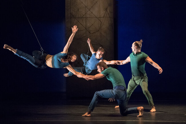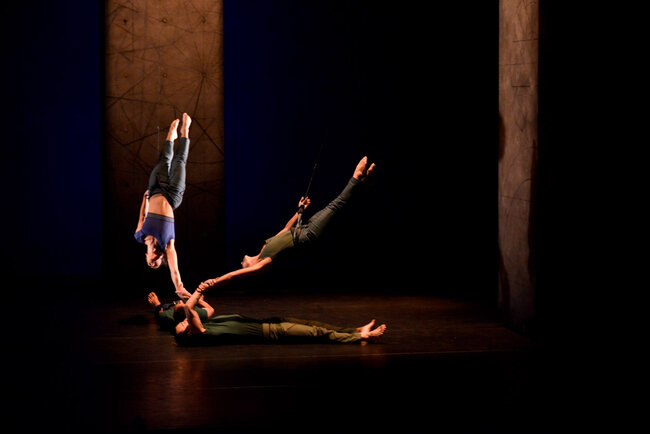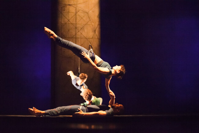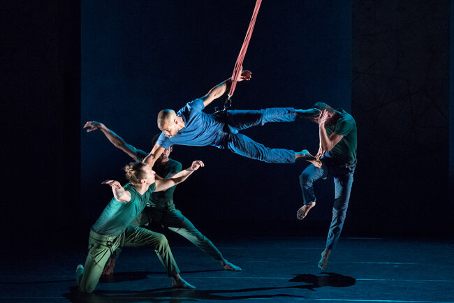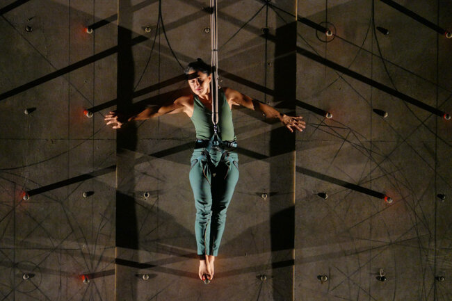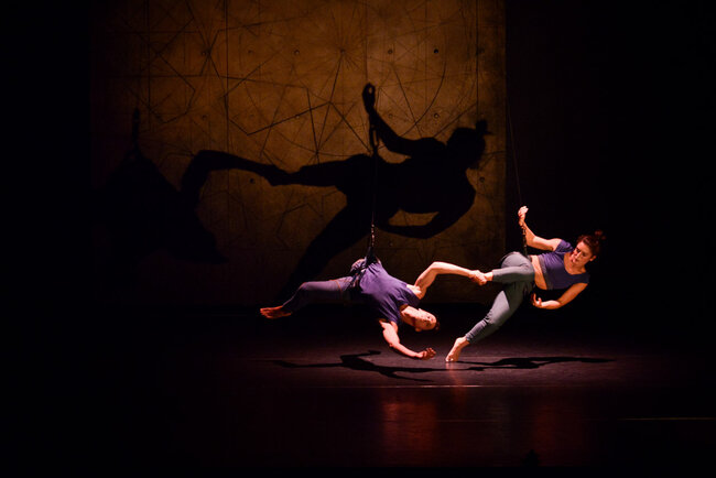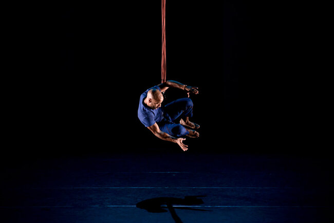 Cette nouvelle « surface » de danse m’amènera à me questionner sur la notion d’espace scénique - comment s’approprier les airs par la danse ? - sur la relation entre des individus au plateau, ici évidente par la notion du lien, du fil qui retient le corps.